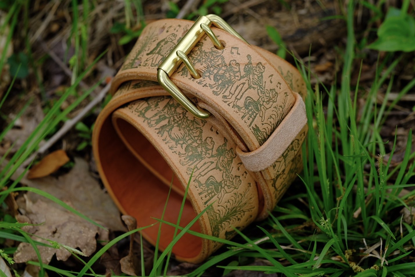 This handmade belt comes with brass hardware and sports completely original frog art you won't find anywhere else.