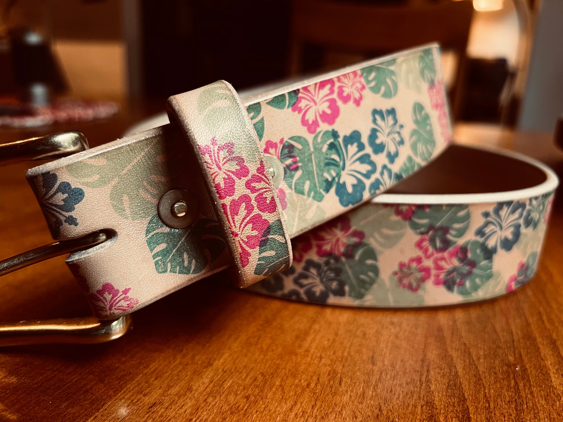 These Hawaiian themed belts are stamped using archival inks, which are permanent and waterproof. The colors are kind of a light pastel.