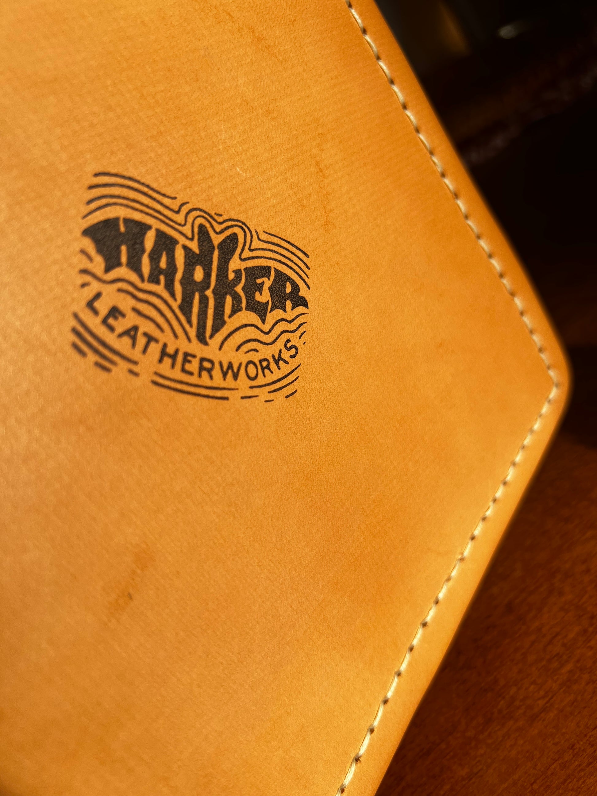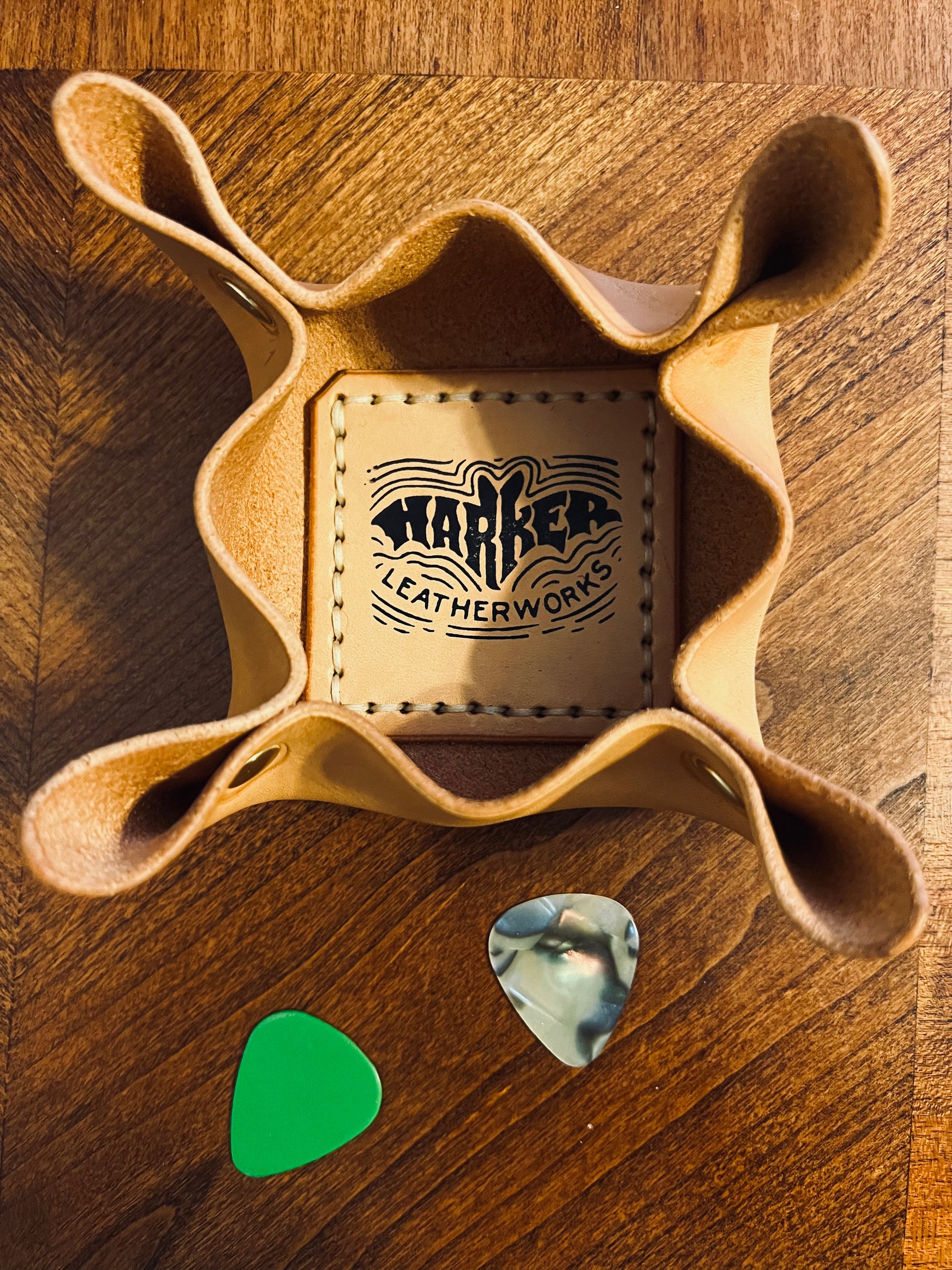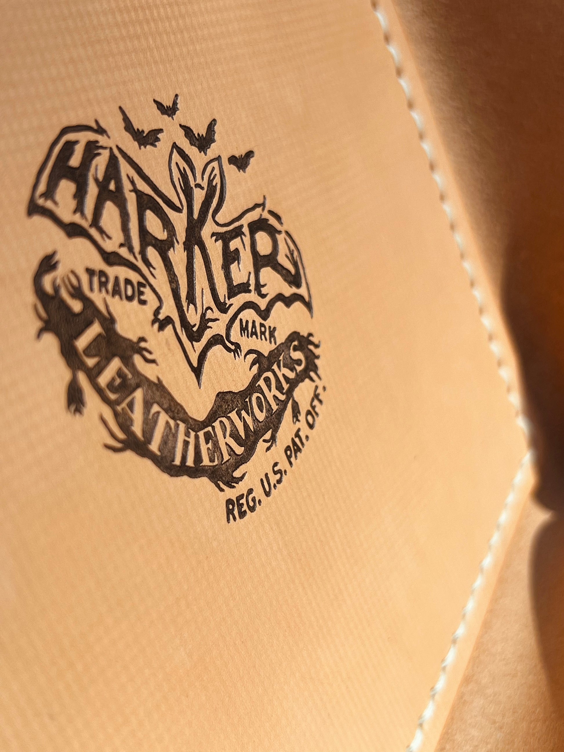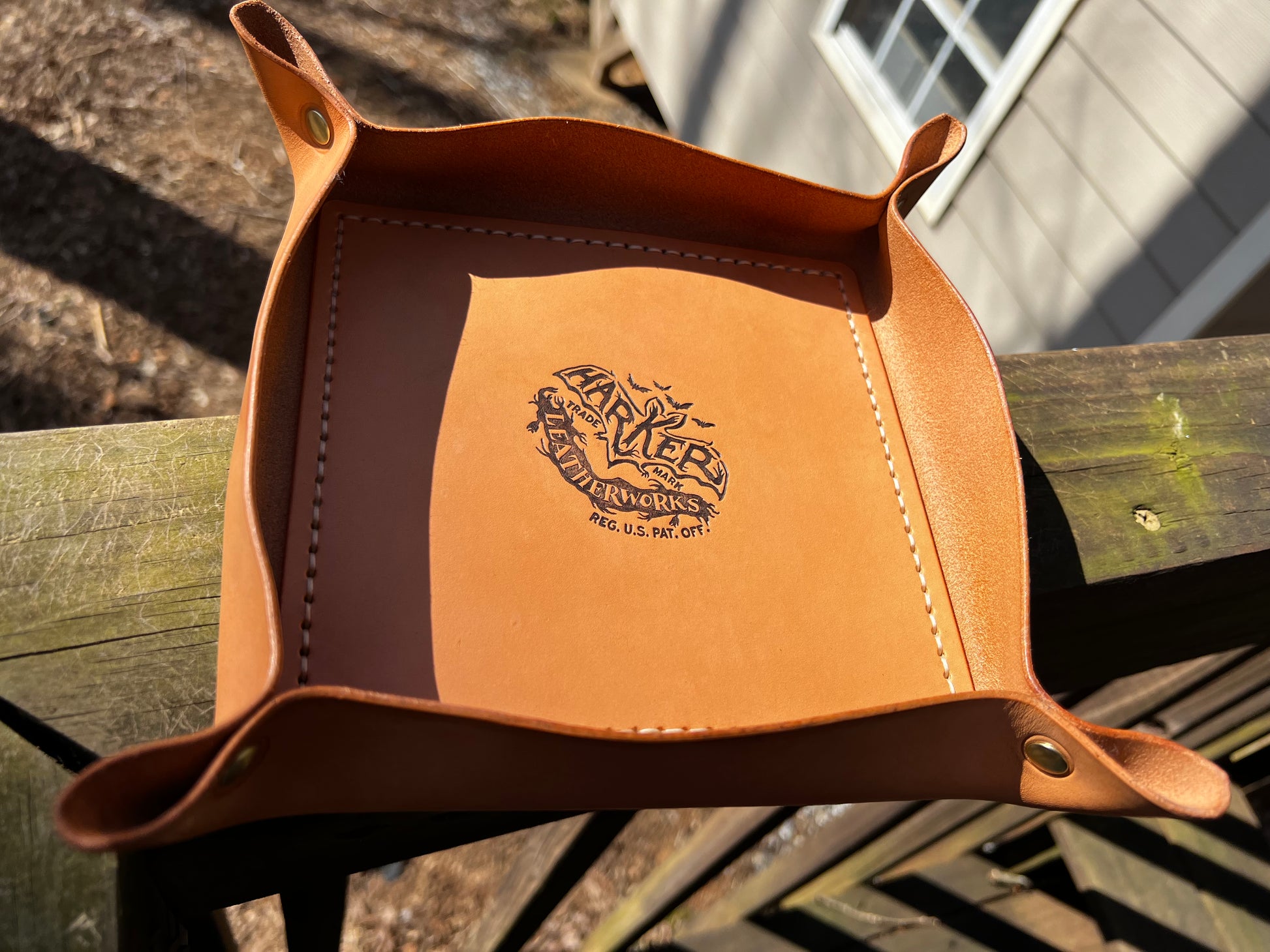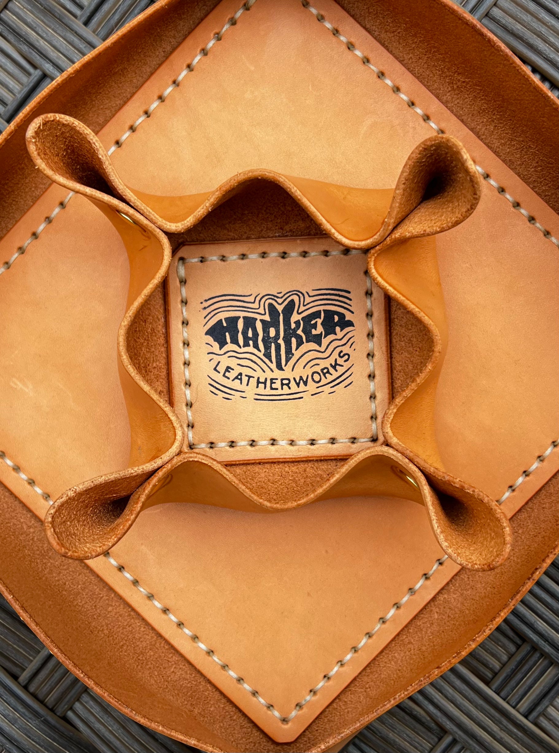 The trays are made from natural veg tan — this stuff ages like a dream. Edges are burnished, and the tray insert features an inked and embossed logo (specific art used depends on size of piece). The back panel is branded with my maker’s mark, which is a rubber ink stamp. The inks used are archival grade, so they’re permanent and won’t wash out.